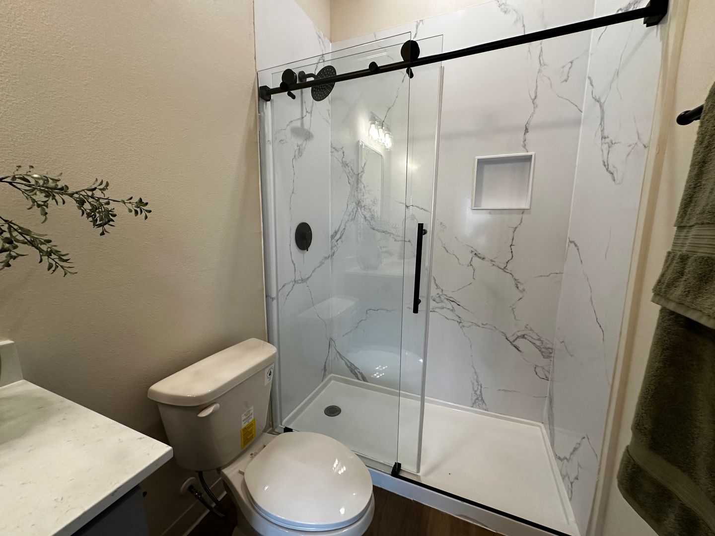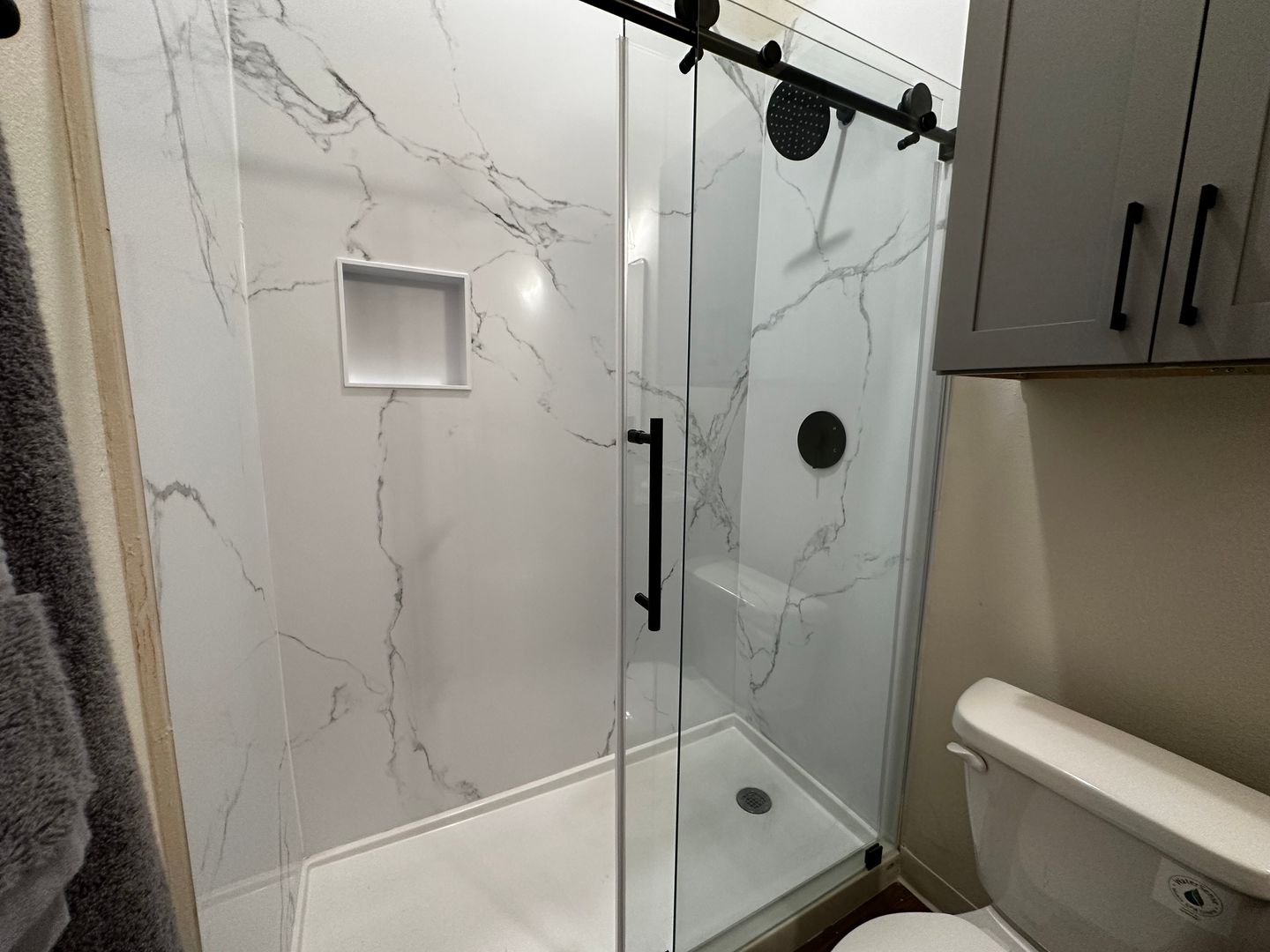 Marble-look tile bathrooms