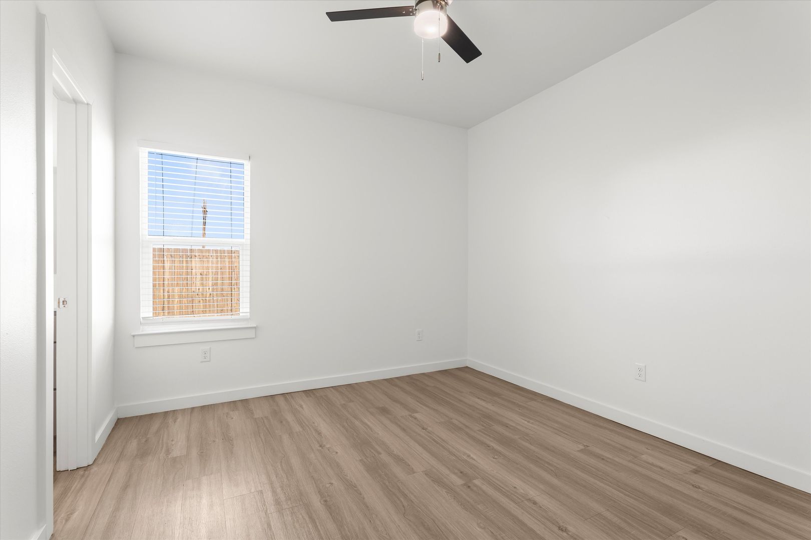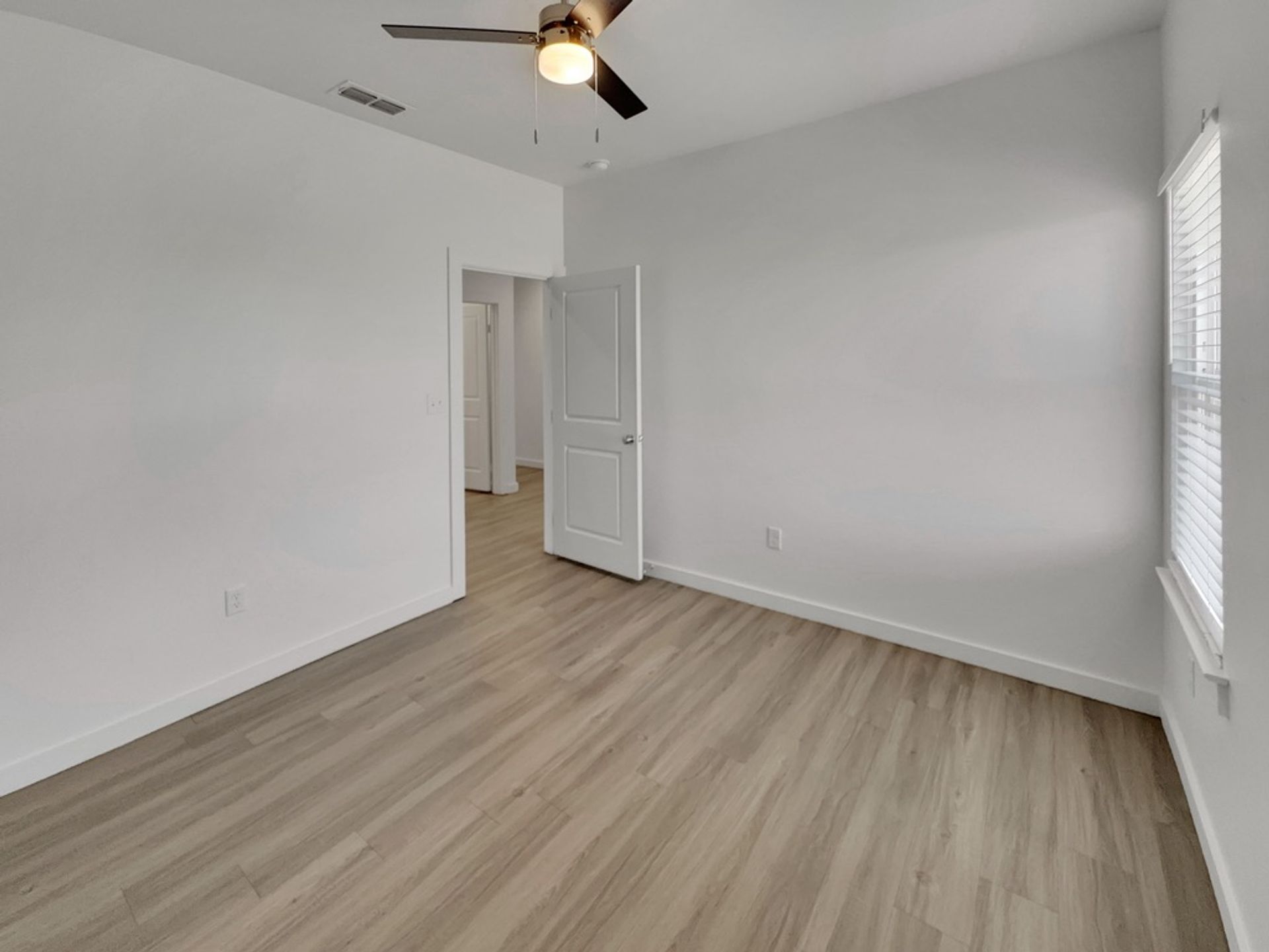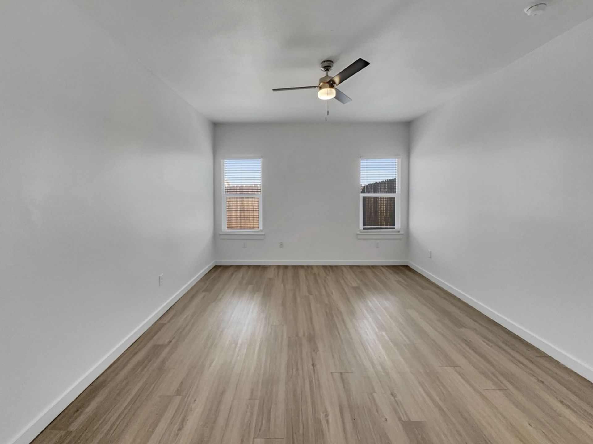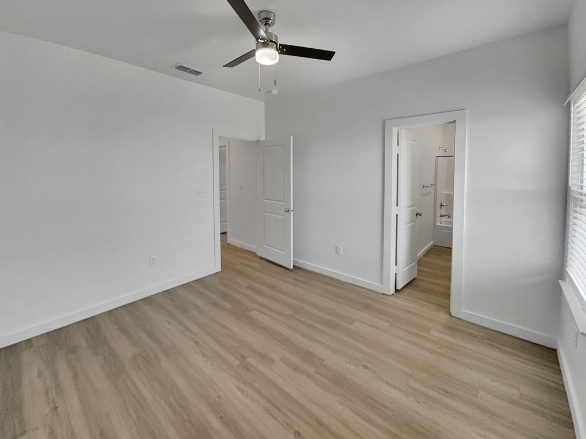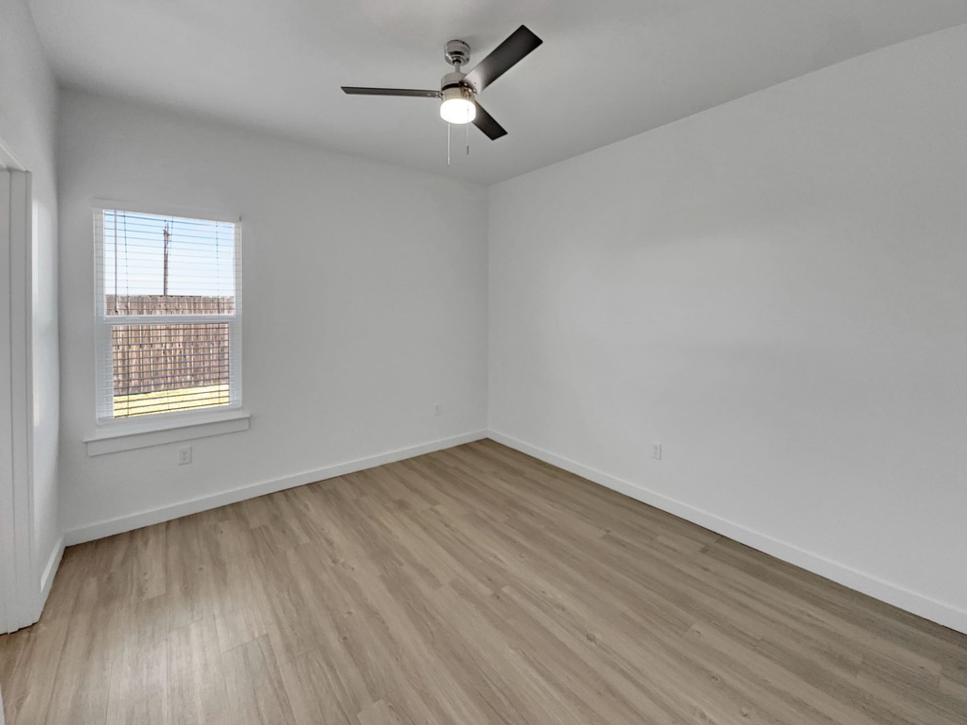 The home has vinyl plank flooring, granite countertops, and stainless steel appliances. Each bedroom has its own private bathroom. There's also a fenced yard and covered patio for outdoor space.