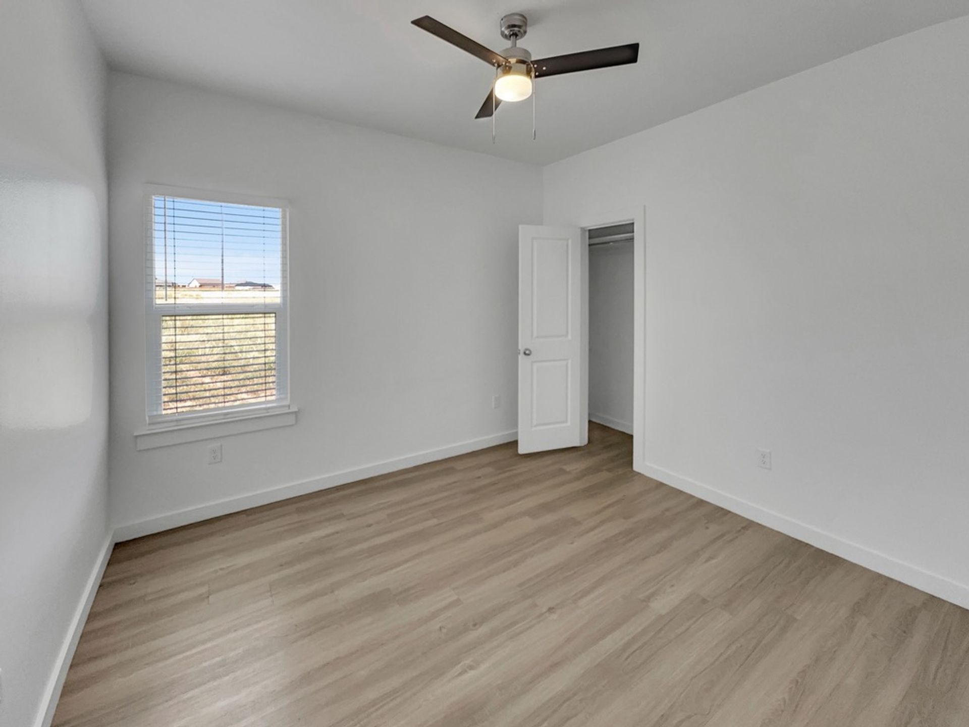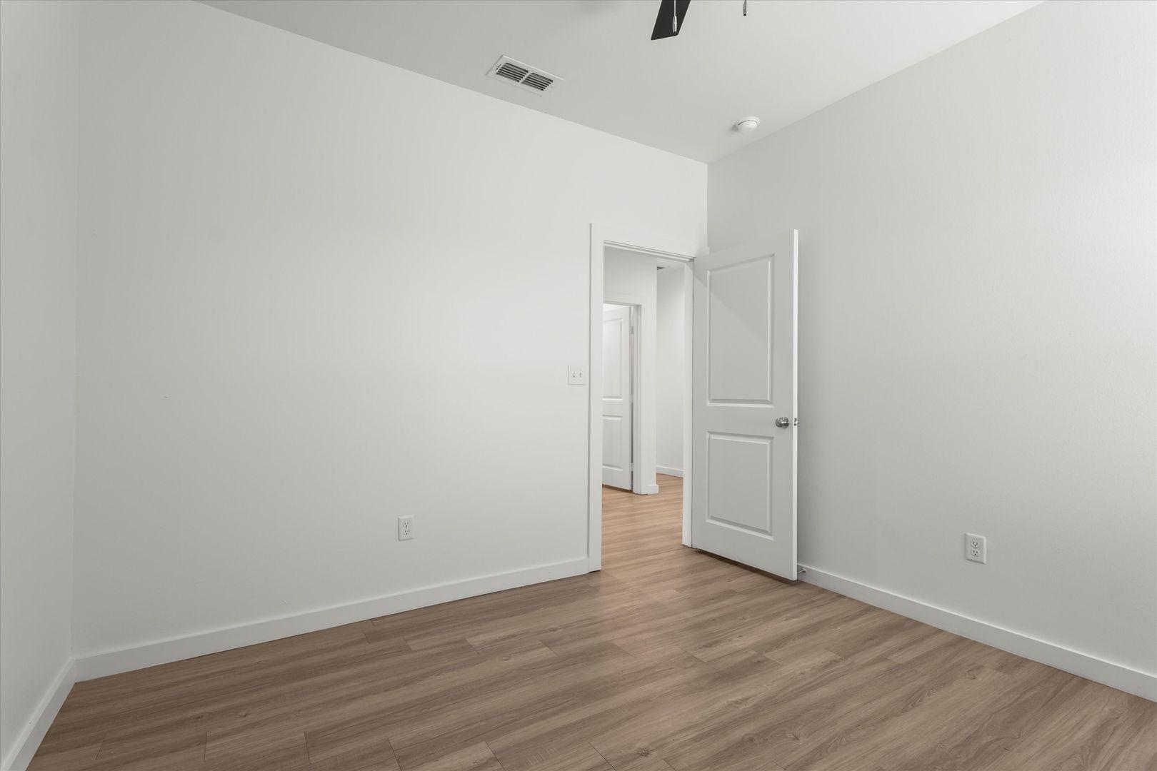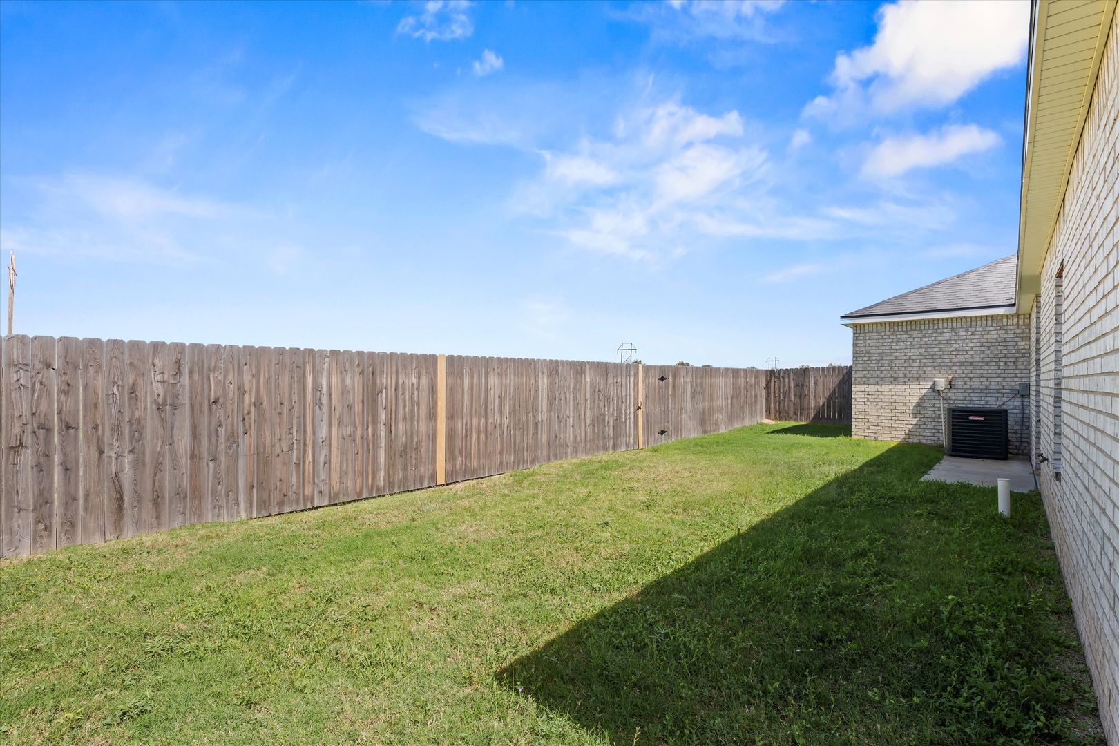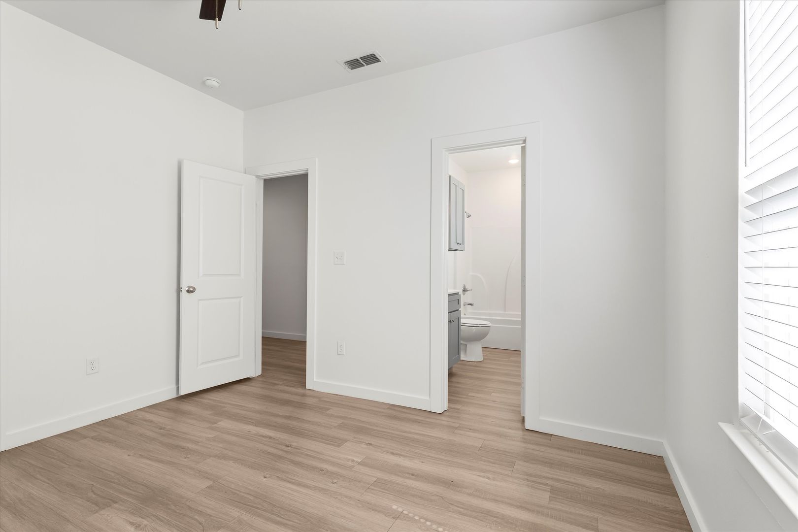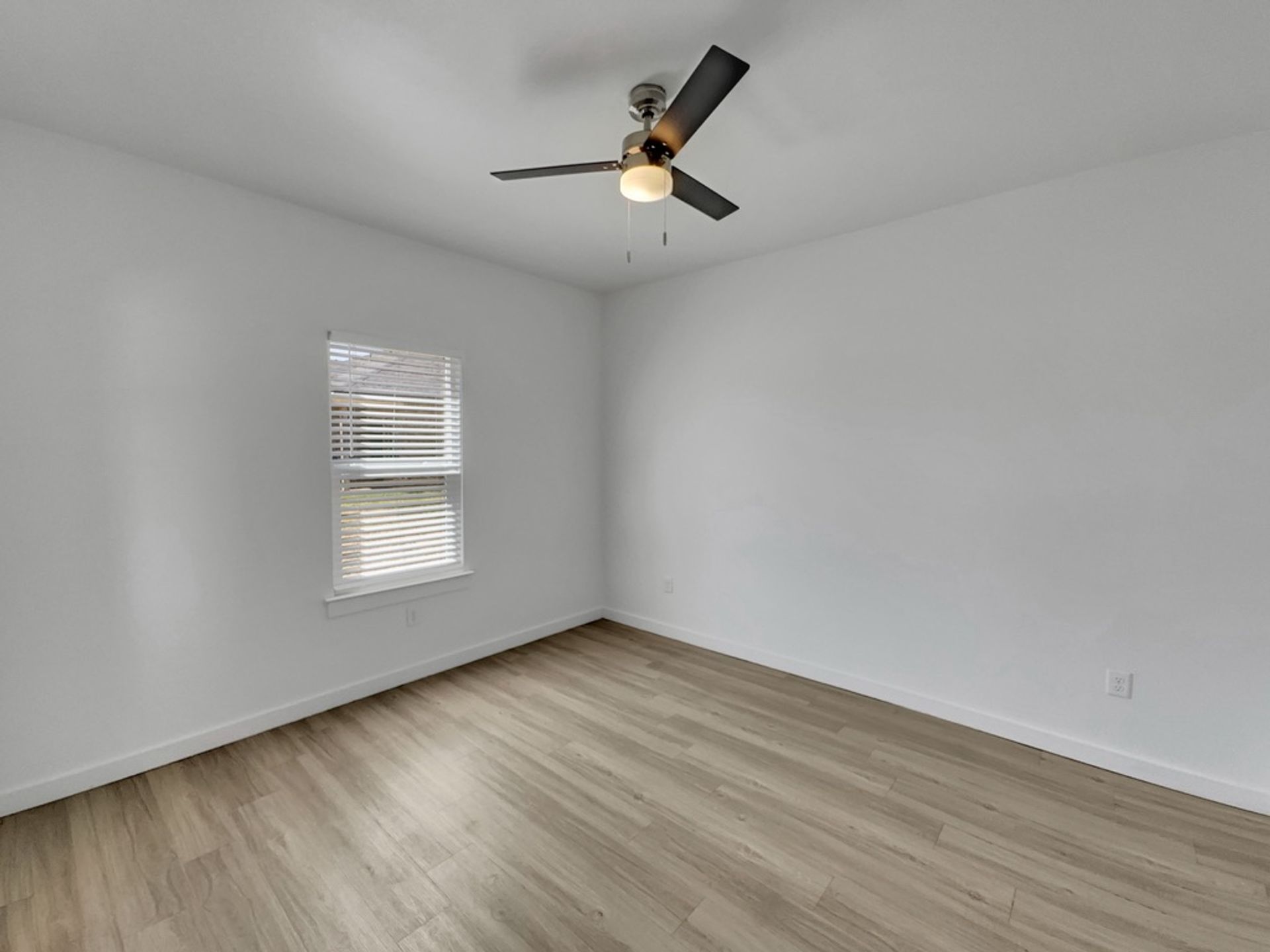 The home has vinyl plank flooring, granite countertops, and stainless steel appliances. Each bedroom has its own private bathroom. There's also a fenced yard and covered patio for outdoor space.