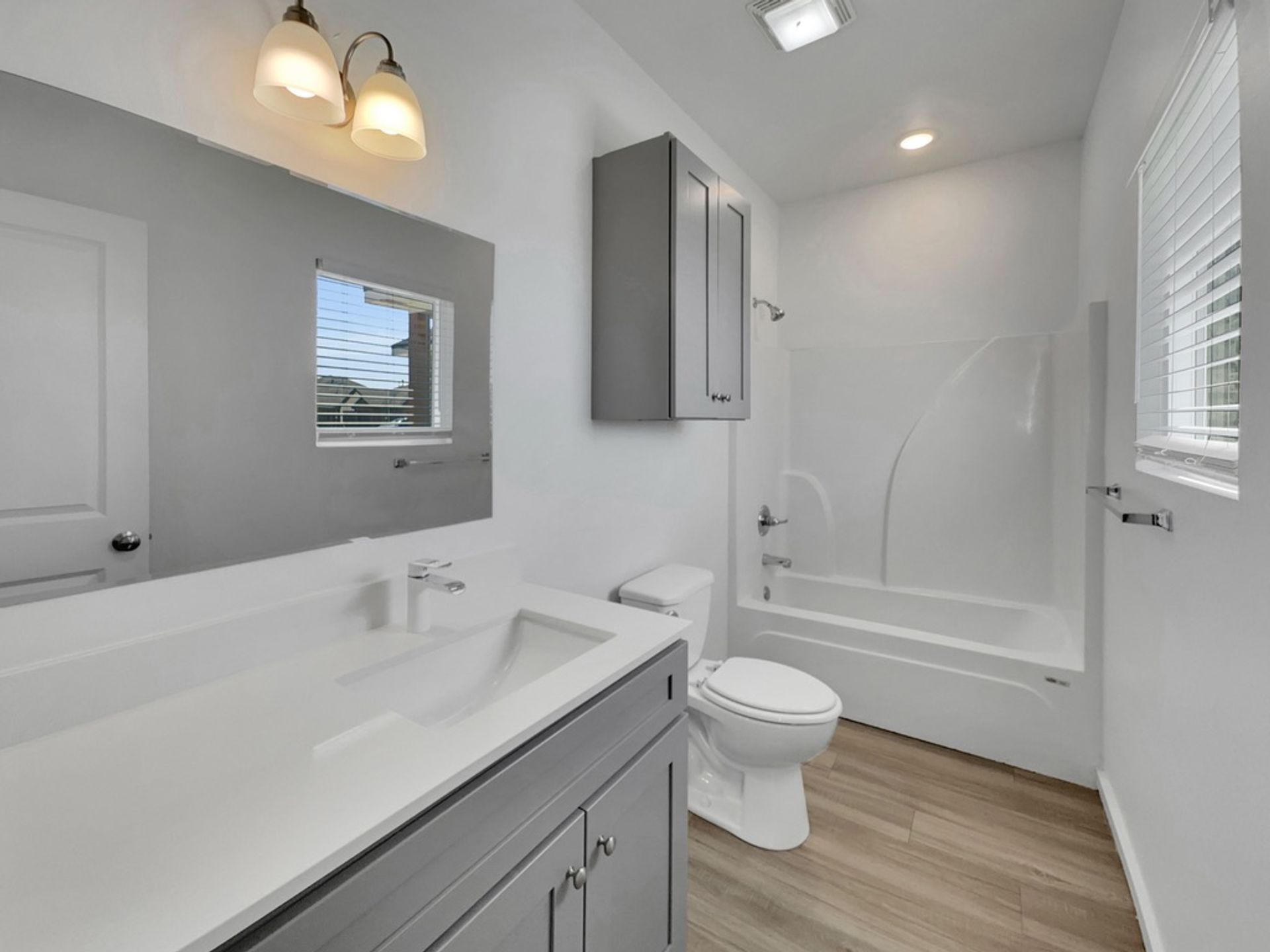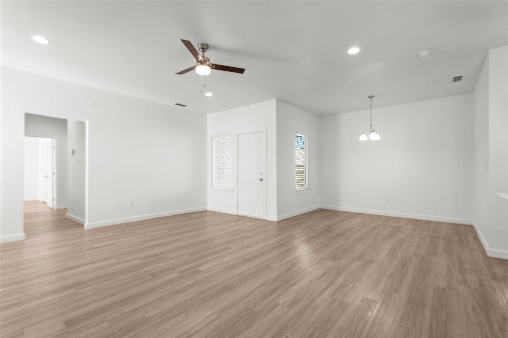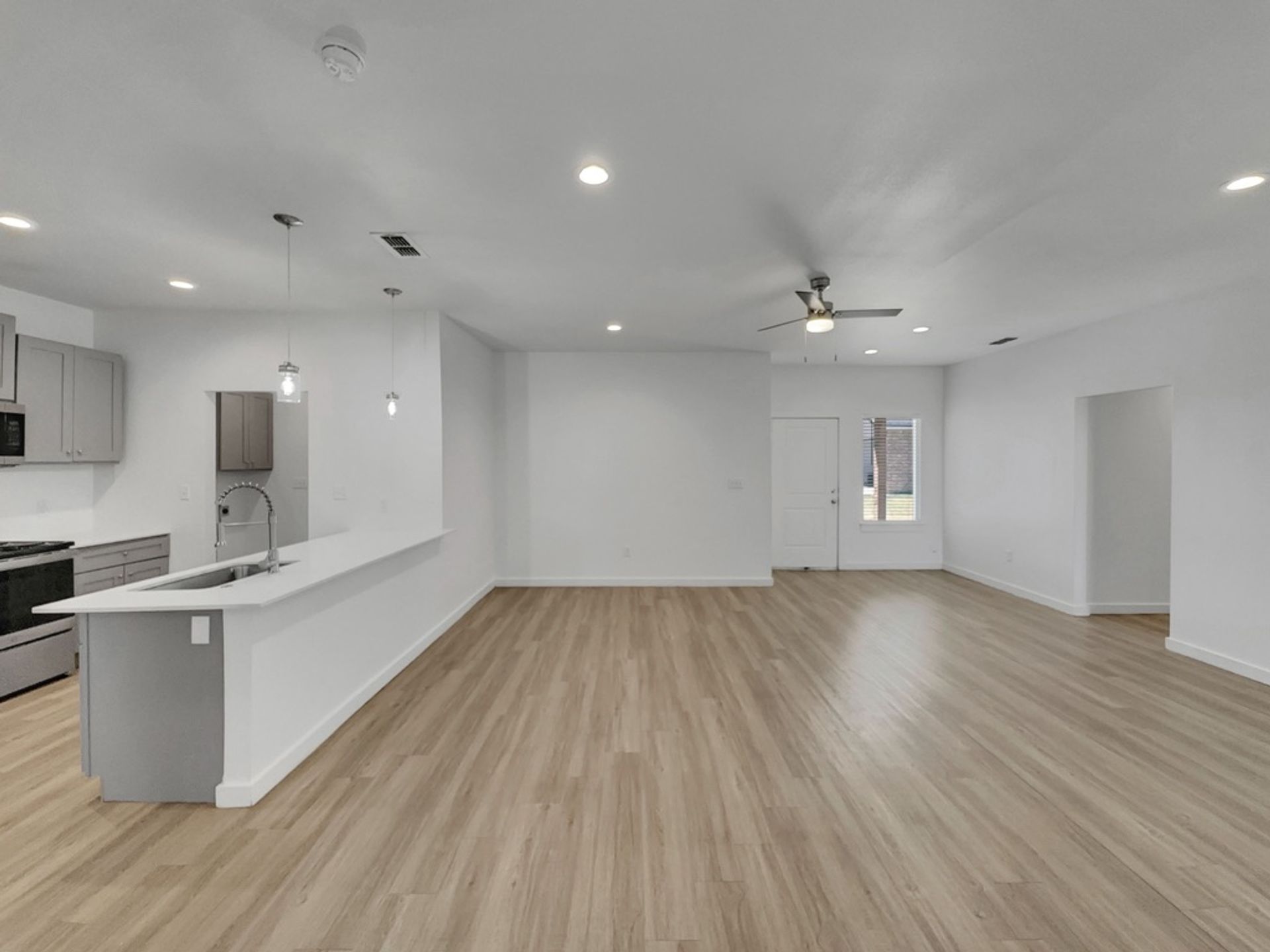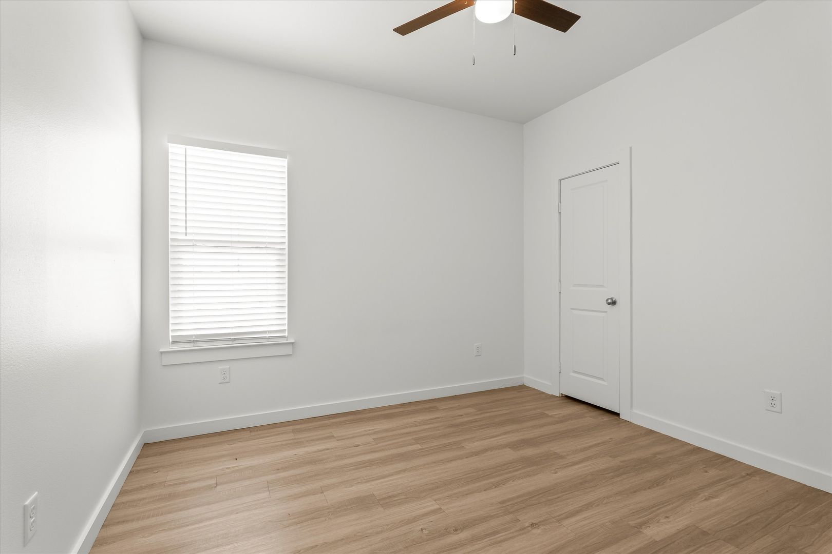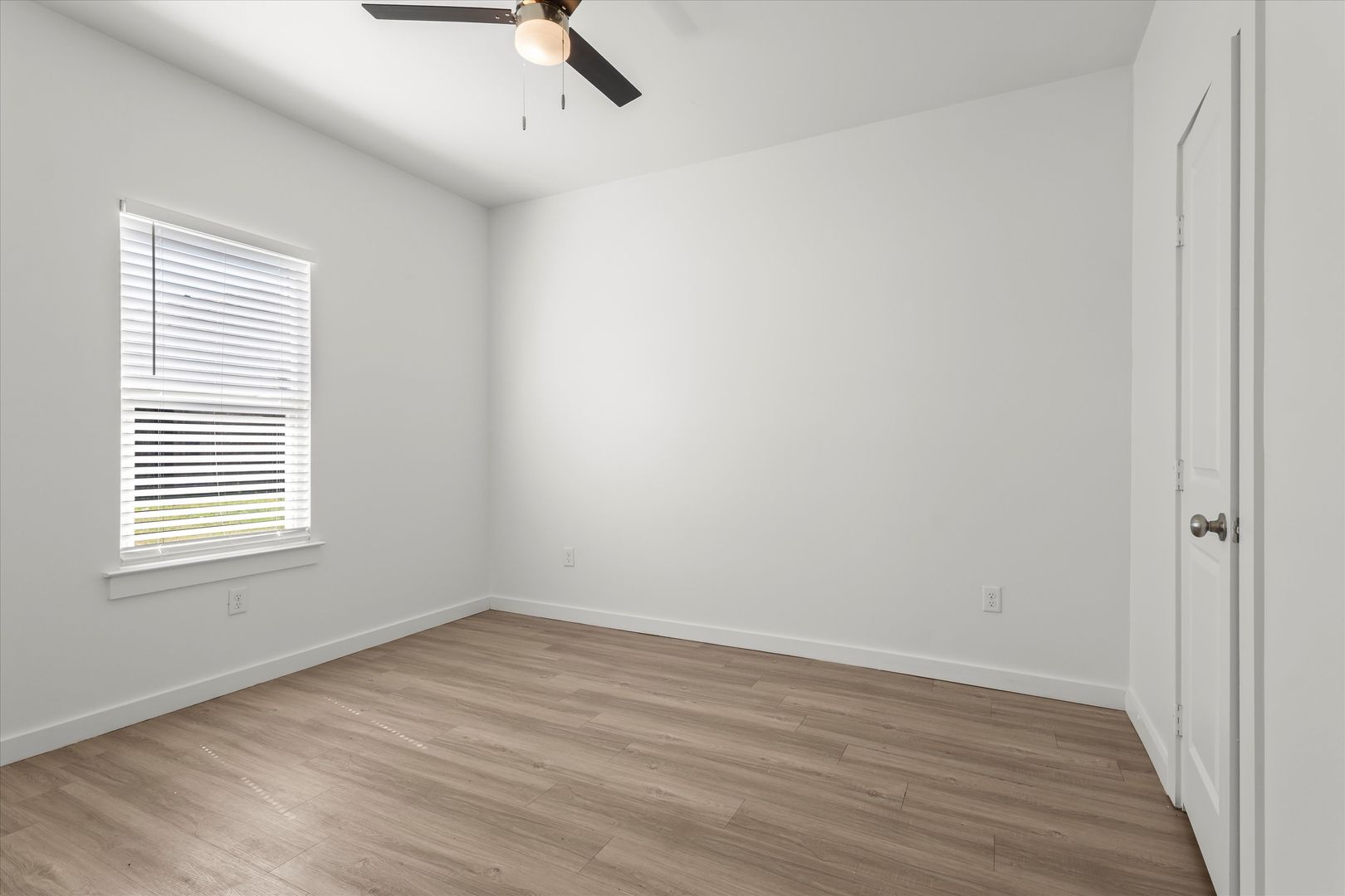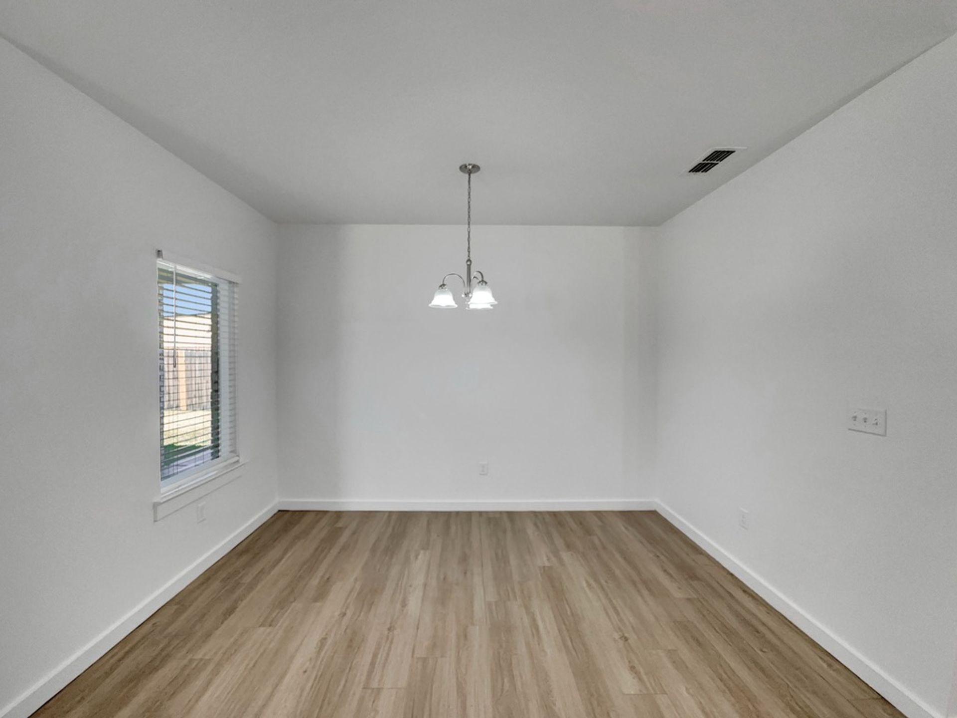 The home has vinyl plank flooring, granite countertops, and stainless steel appliances. Each bedroom has its own private bathroom. There's also a fenced yard and covered patio for outdoor space.