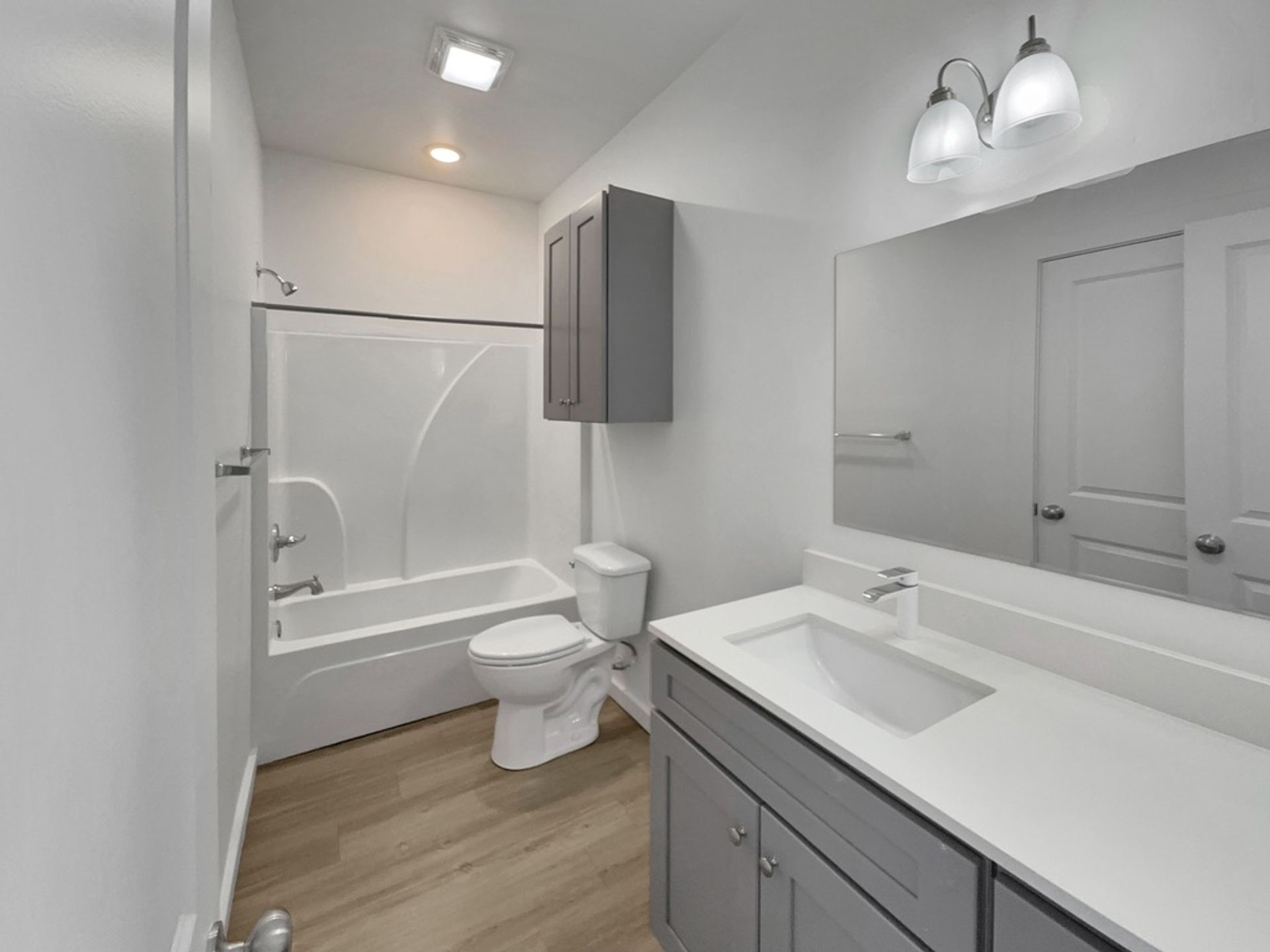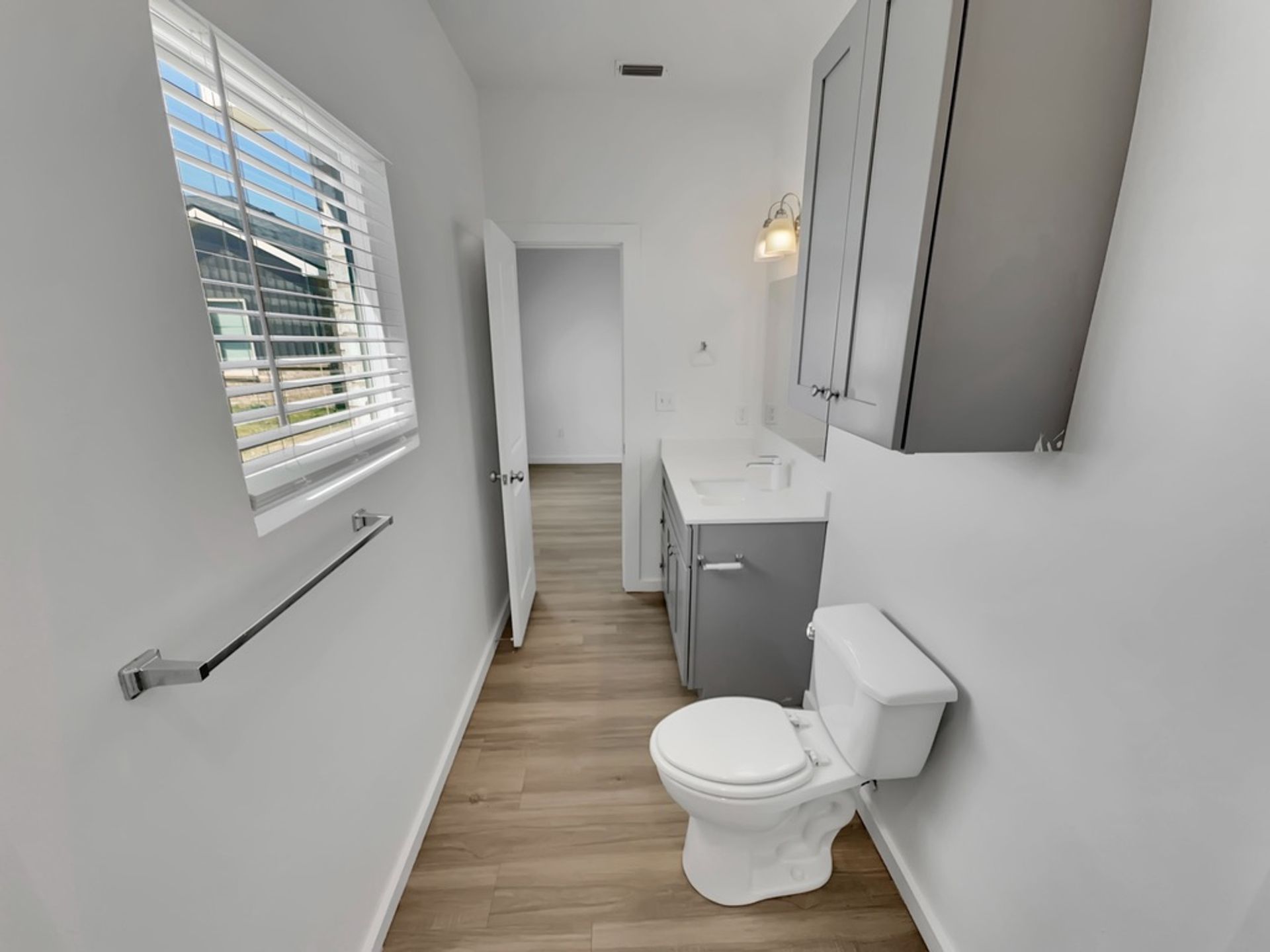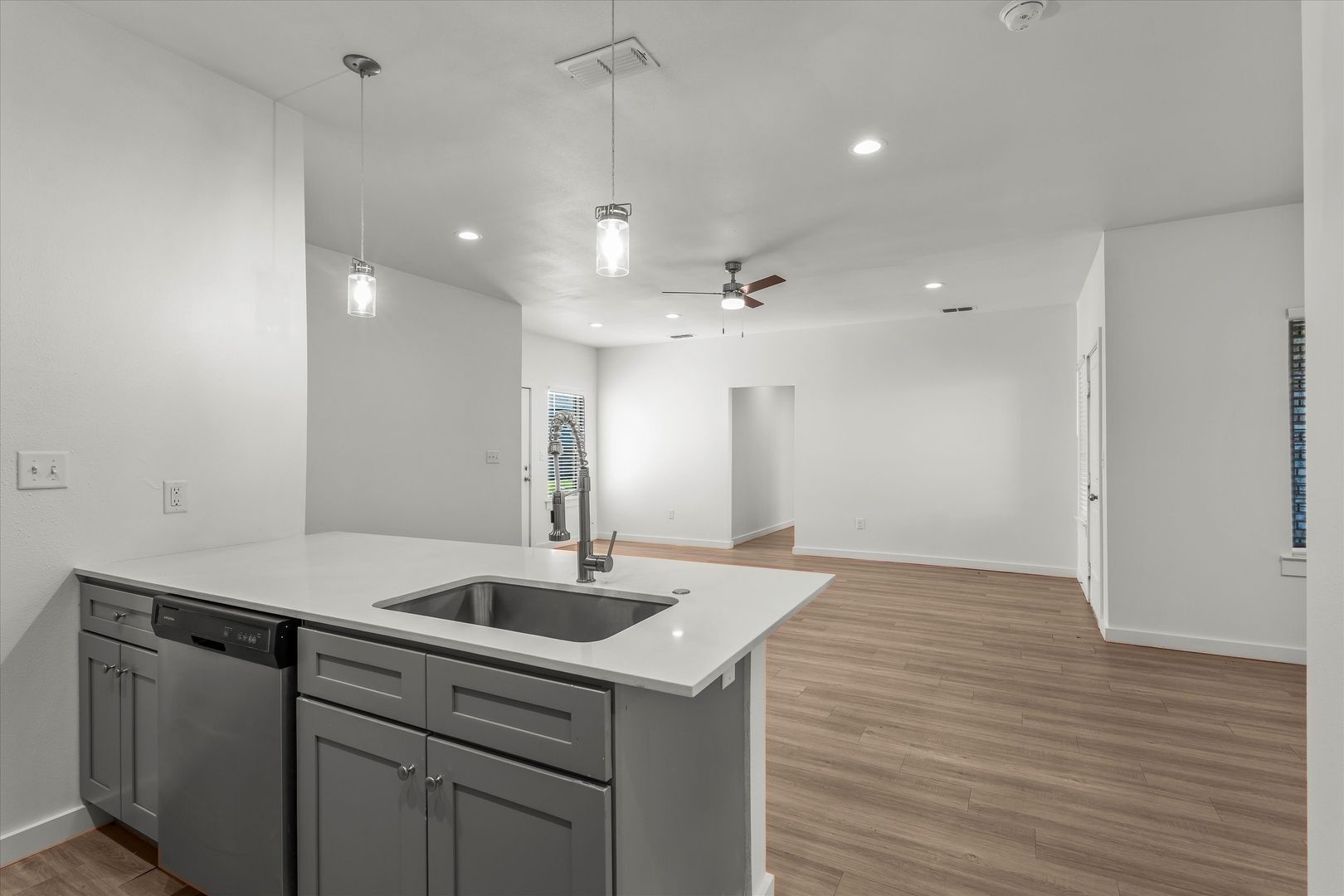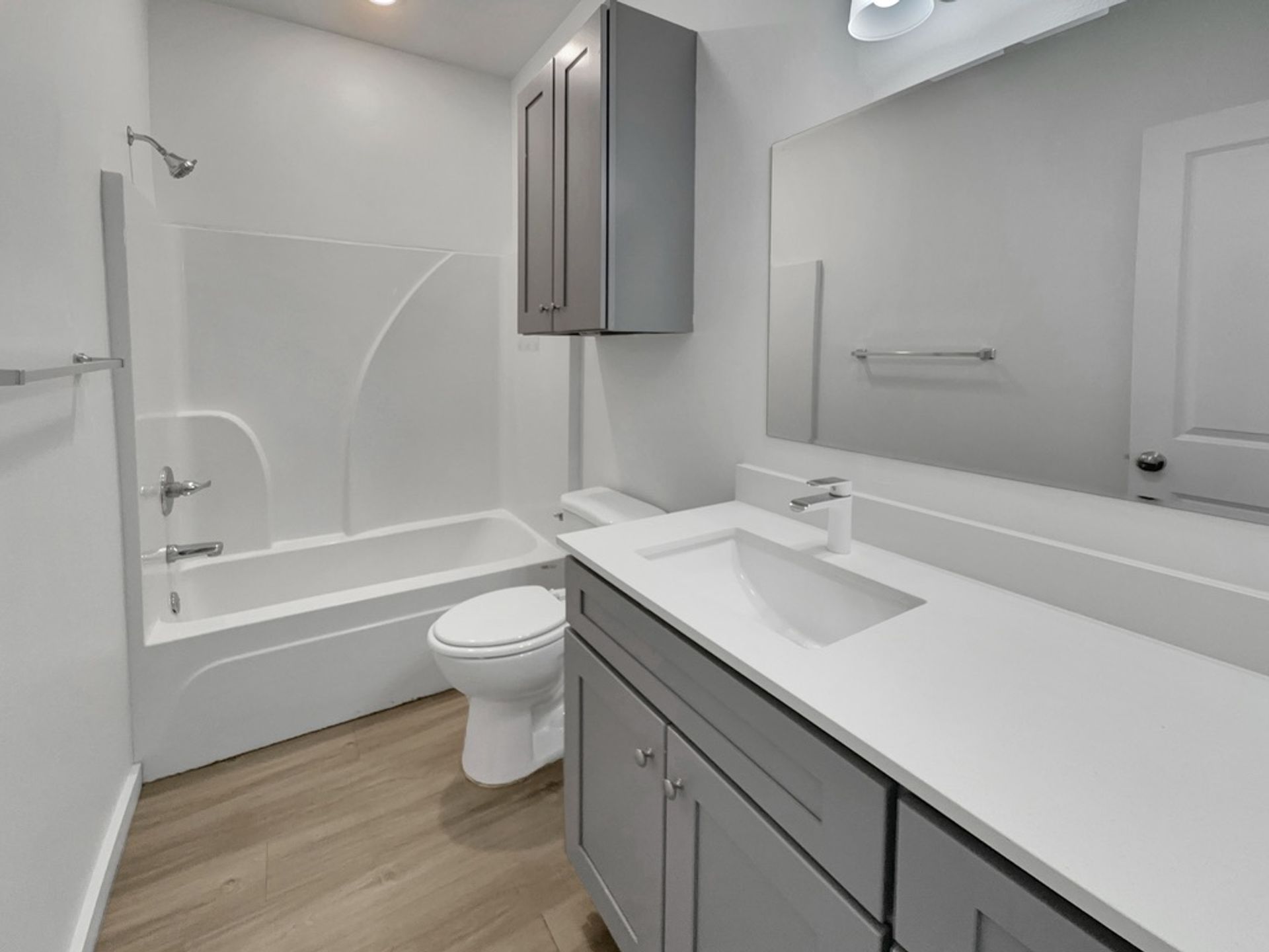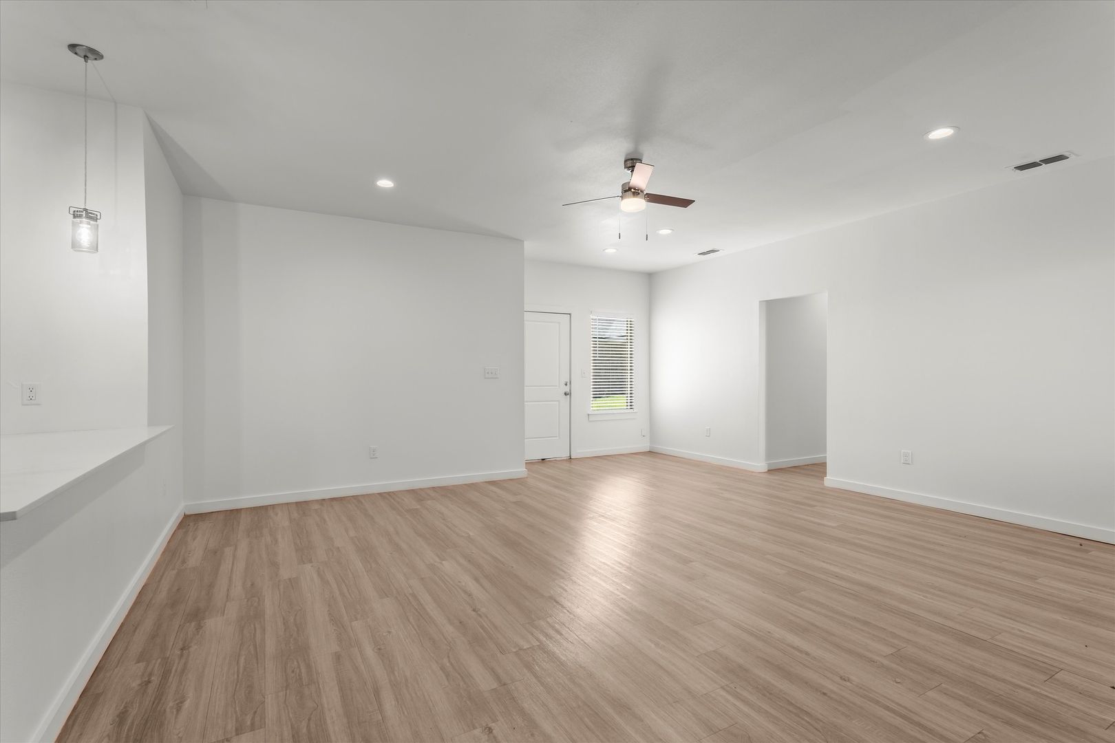 The home has vinyl plank flooring, granite countertops, and stainless steel appliances. Each bedroom has its own private bathroom. There's also a fenced yard and covered patio for outdoor space.