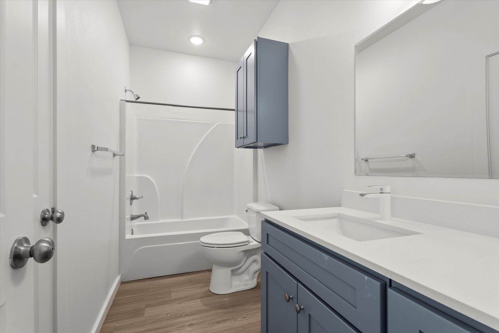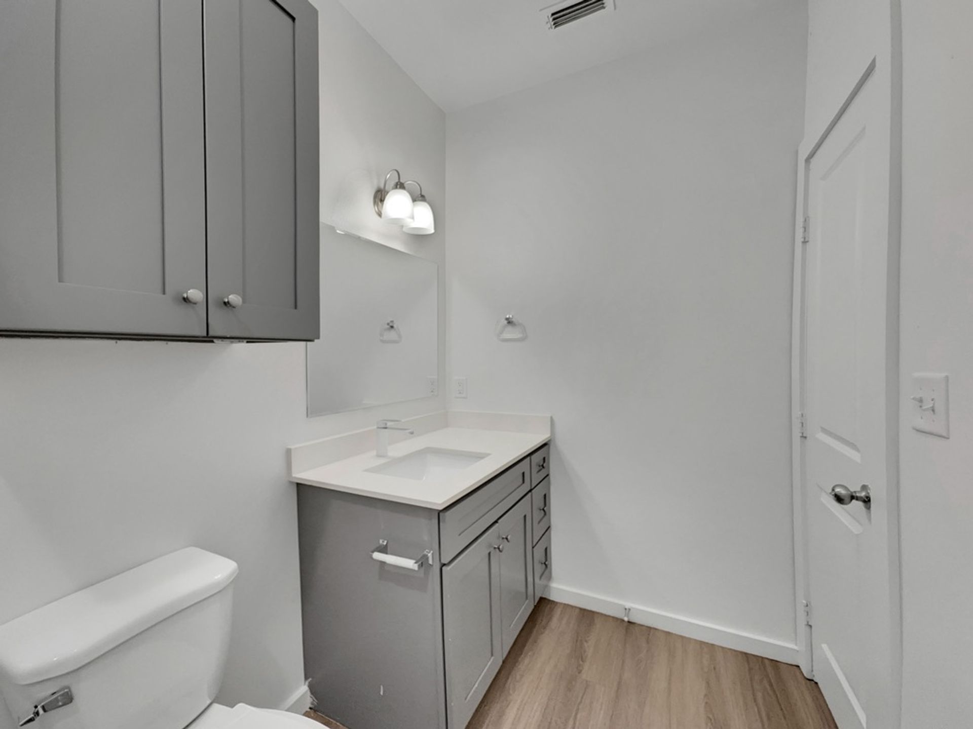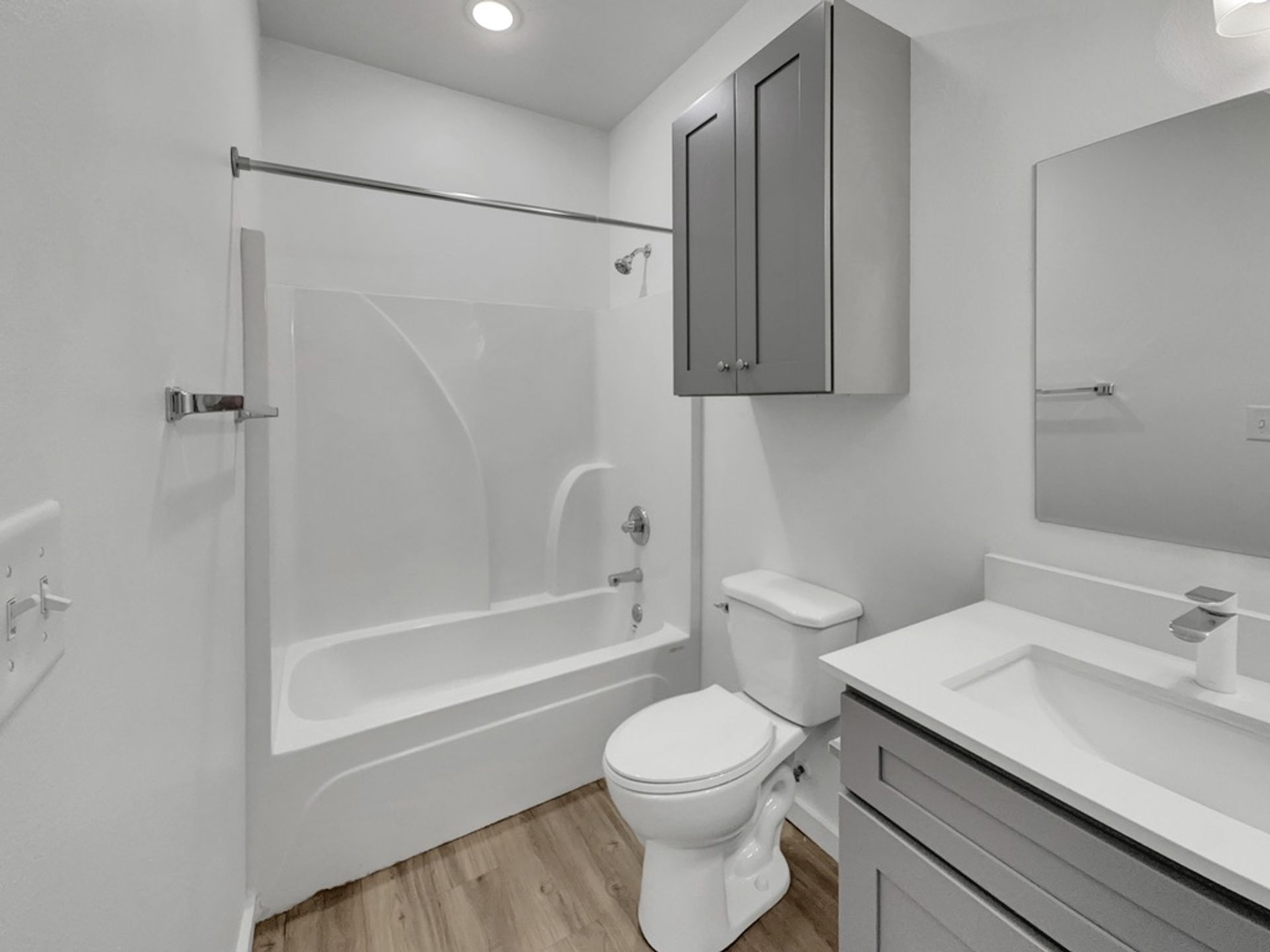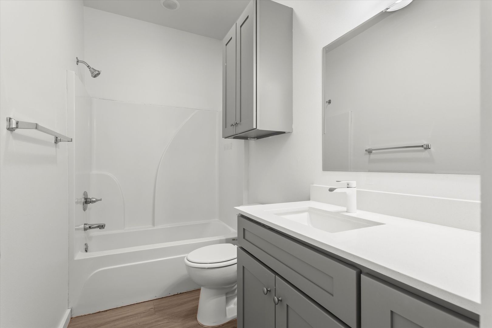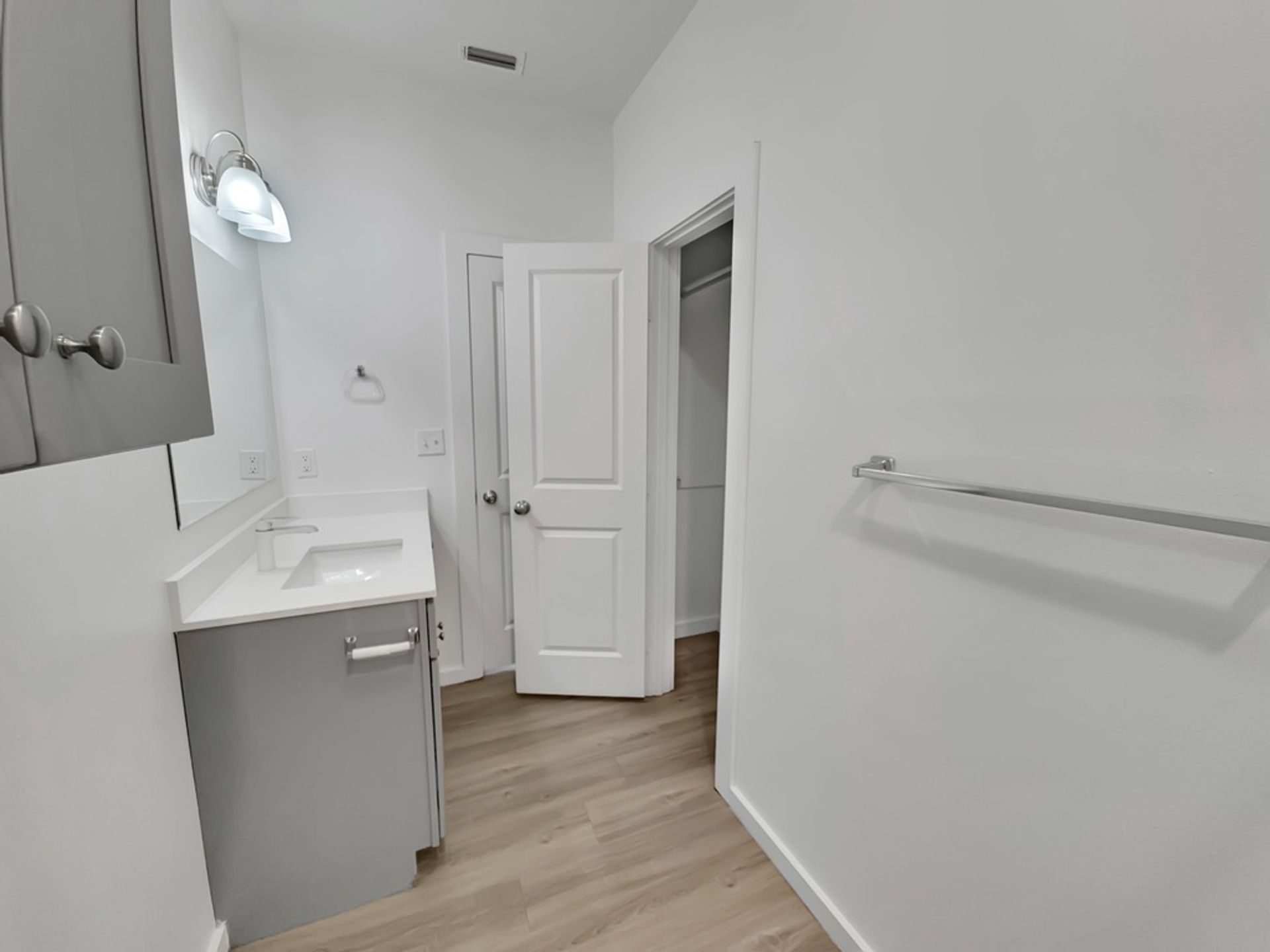 The home has vinyl plank flooring, granite countertops, and stainless steel appliances. Each bedroom has its own private bathroom. There's also a fenced yard and covered patio for outdoor space.