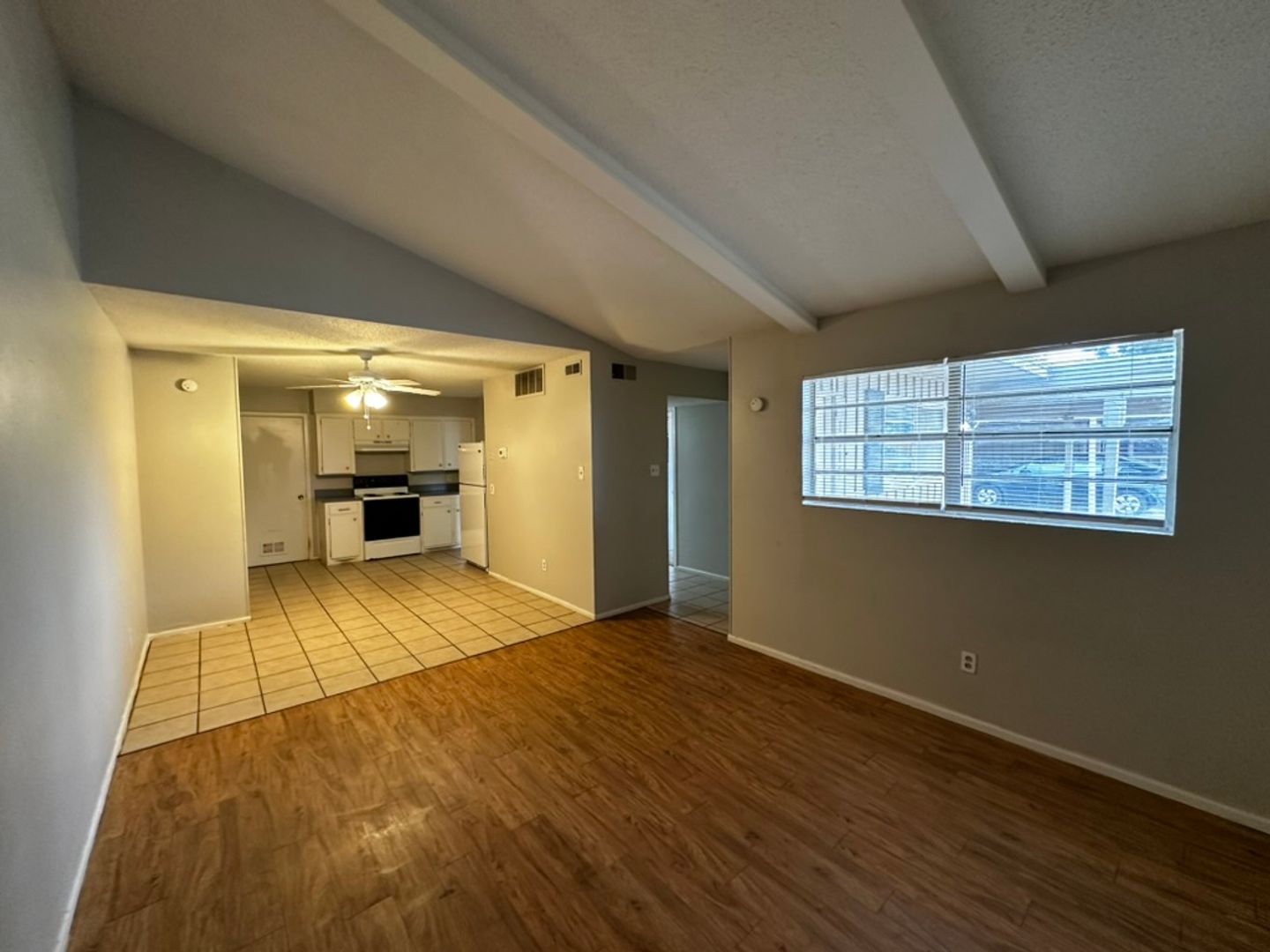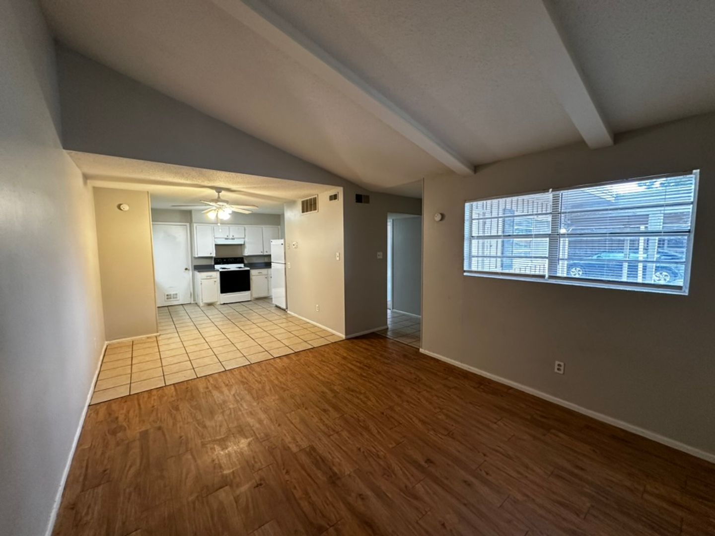 Well-maintained 2-bedroom, 1-bath quadplex featuring a comfortable floor plan with vaulted ceilings in the living room and central heat and air. The spacious kitchen provides plenty of cabinet and counter space, and the laundry room includes washer/dryer connections. Covered parking is included for convenience.